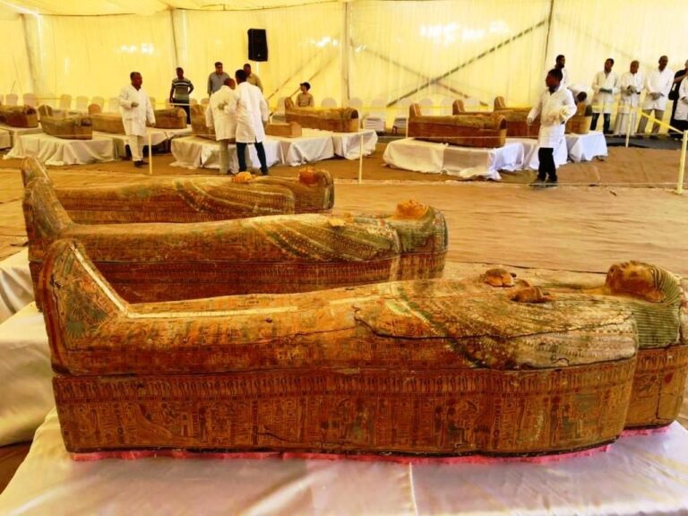 This Saturday morning near the temple of Hatshapsout, a press conference was held to present the thirty painted wooden sarcophagi, discovered a few days ago in Assasif in the Valley of Kings near Lurxor, in southern Egypt.