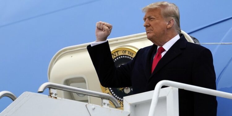 The presidential helicopter Marine One transporting Donald and Melania Trump flew from the White House gardens. Pronouncing only a few words, the outgoing president spoke of a “fantastic four -year” mandate, representing “the honor of a life”.