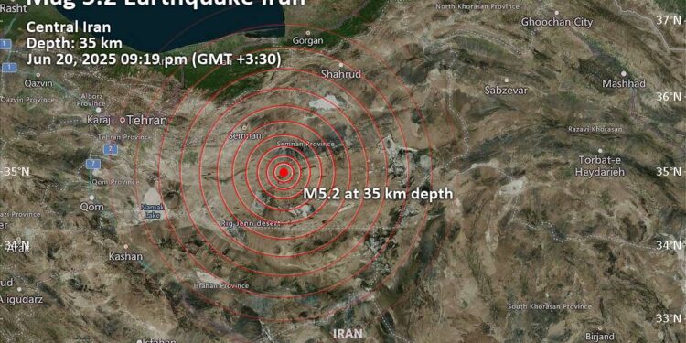 An earthquake of a magnitude of 5.2 struck this Friday, June 20, 2025 at 8:49 p.m. (local time) about 87 km south-east of Semnan, in the province of the same name, in Iran. The information was reported by the Euro-Mediterranean seismological center (EMSC).