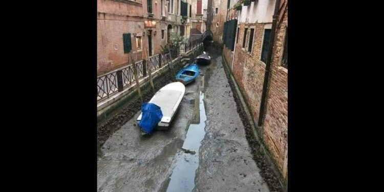 In Venice, due to low precipitation and an exceptionally long tide, the canals have become dry.