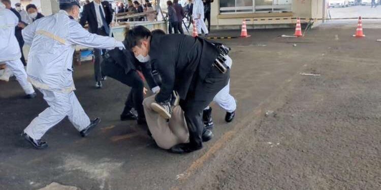 Several media, including the Kyodo news agency, reported that an object resembling a “smoke bomb” had been launched, but that there did not seem to be injured or visible damage to the scene.