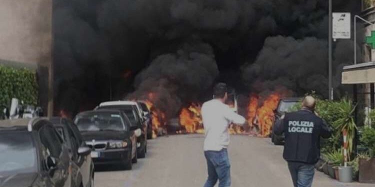 Images broadcast by Sky TG24 show a thick cloud of black smoke rise above flames vehicles in a street in the district of the Romana porta in Milan, capital of Lombardy in northern Italy, and firefighters in intervention.