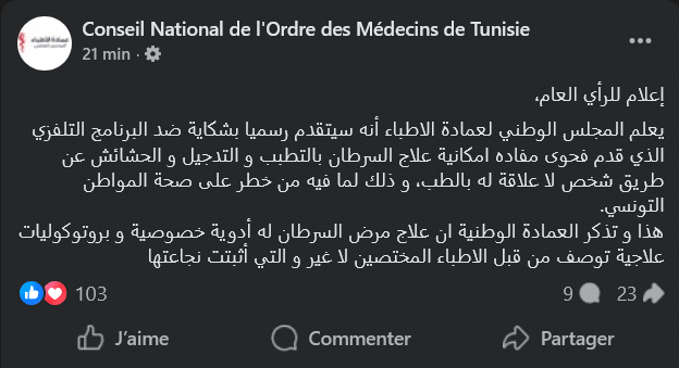 The National Council of the Order of Physicians announced that it will officially file a complaint against a television program that broadcast an episode presenting the treatment of cancer by non-medical methods, endangering the health of Tunisian citizens.