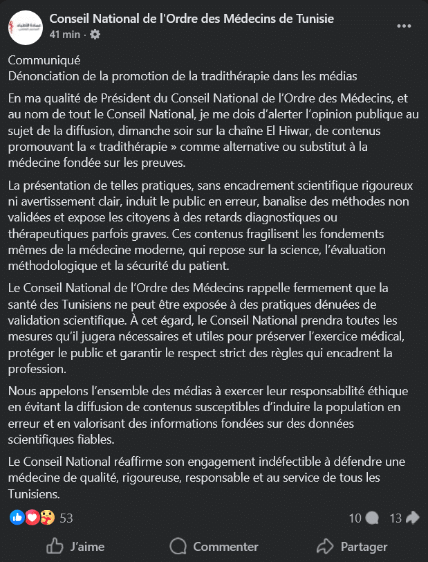 The National Council of the Order of Physicians of Tunisia, today published a press release specifying that this content, often presented without scientific supervision or warning, disorients the public and can delay the diagnosis or treatment of serious illnesses.