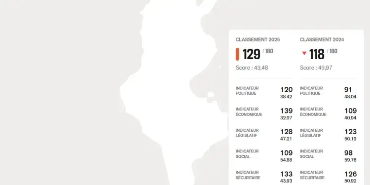 This decline is also visible in the overall score assigned by RSF, which measures press freedom on a scale from 0 to 100. Tunisia fell from 49.97 points in 2024 to 43.43 points in 2025.