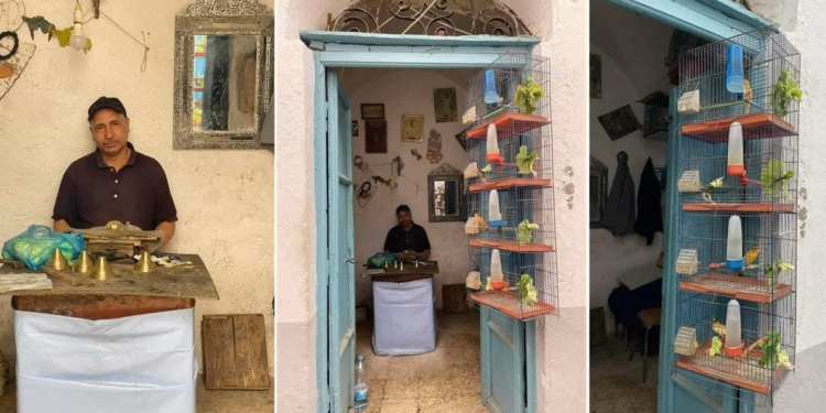Surrounded by several canaries, Habib listens to them respond to each other by modulating their trills. Sitting in front of his workbench, he hammers the copper and, with fine punches, chisels the pieces that follow one another in his hands.