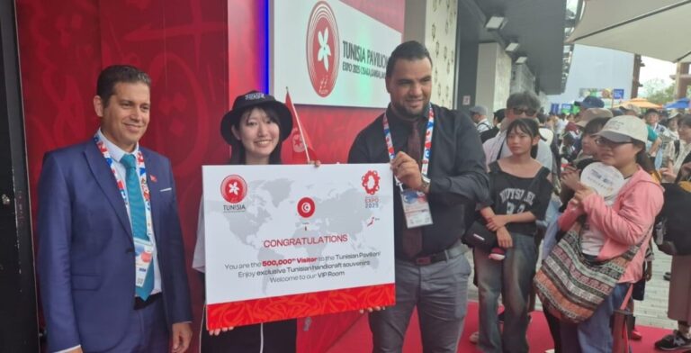 استقبل الجناح التونسي في المعرض العالمي بأوساكا 2025 زائره رقم 500,000، وهو إنجاز بارز لهذا الفضاء الصغير الذي تبلغ مساحته 300 متر مربع والذي نجح في جذب جمهور دولي متزايد. وفقًا لمركز النهوض بالصادرات (CEPEX)، تم استقبال الزائر نصف المليون في أجواء احتفالية: تصفيق، استقبال في قاعة الشرف وتقديم هدايا من الحرف التقليدية، وهي تجسيد حقيقي للتراث التونسي.
