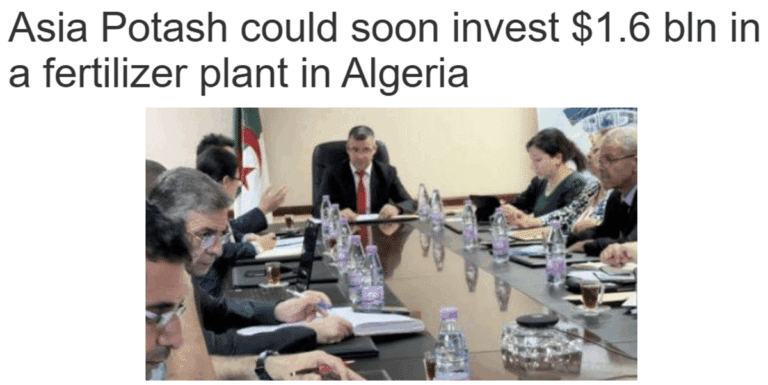 وفقاً لمنشور على صفحة فيسبوك الخاصة بحسام سعد، عضو جمعية Alert، فإن مجموعة آسيا بوتاش الدولية للاستثمار قد اختارت الجزائر لتطوير مجمع صناعي متكامل بقيمة 1.6 مليار دولار، يهدف إلى استغلال الفوسفات وإنتاج الأمونياك واليوريا والأسمدة المركبة. سيعتمد المشروع بشكل رئيسي على الغاز الطبيعي لعملياته الصناعية ويتماشى مع الاستراتيجية الجزائرية لتنويع الاقتصاد بعيداً عن المحروقات، مستغلاً الاحتياطيات المحلية الضخمة المقدرة بأكثر من 4 مليارات طن.
