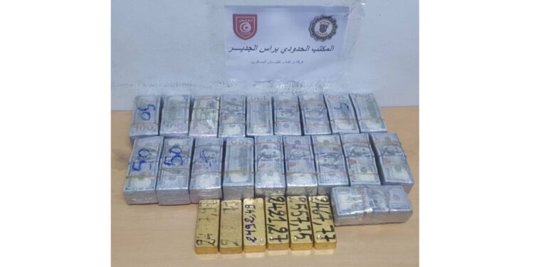 أحبط أعوان الديوانة في المعبر الحدودي برأس جدير محاولة تهريب كبيرة تضمنت ما يقارب مليون دولار من العملات الأجنبية وعدة سبائك ذهب. تمت عملية الحجز يوم الجمعة في سيارة كانت على وشك مغادرة الأراضي التونسية، وفقًا للإدارة العامة للديوانة