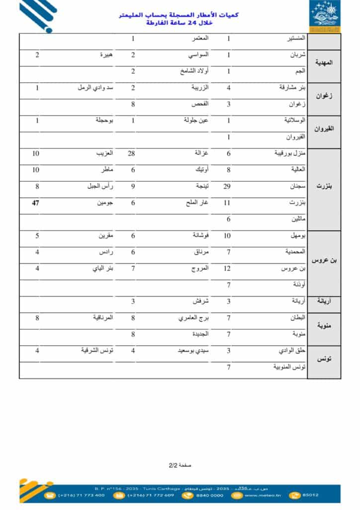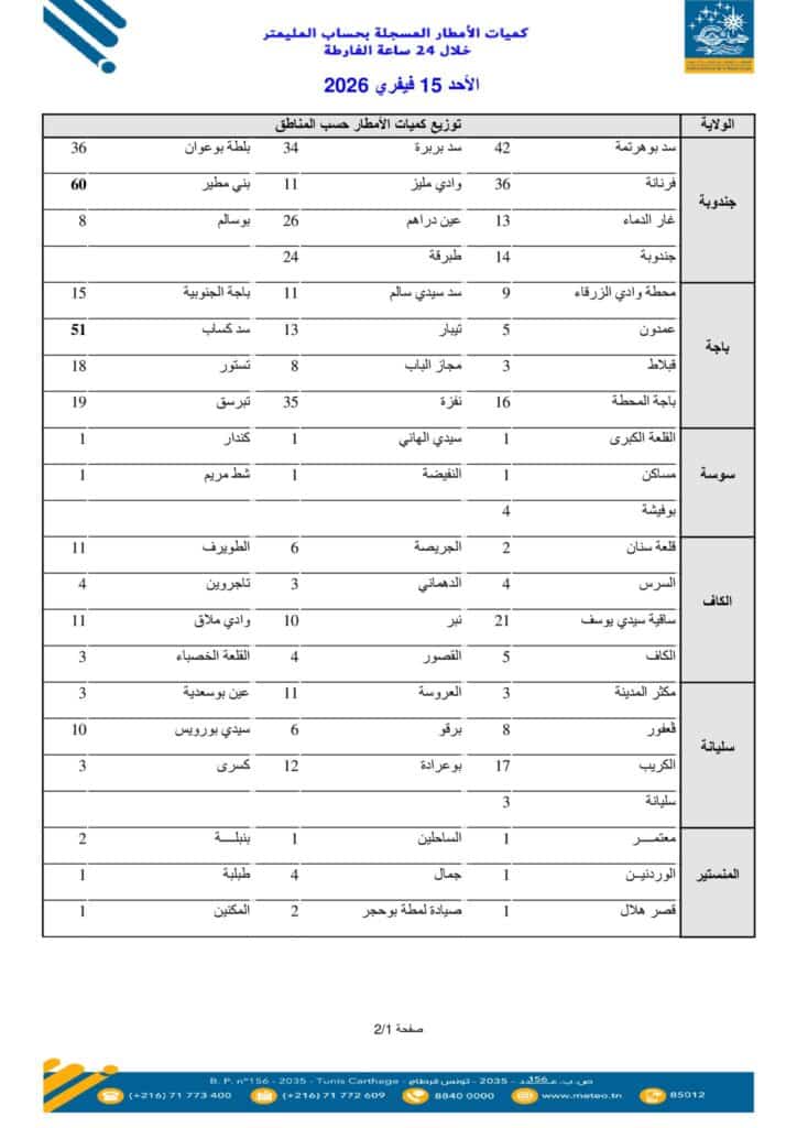Les cumuls les plus élevés ont été relevés au nord-ouest. La station de Beni M’tir, dans le gouvernorat de Jendouba, a enregistré 60 millimètres. Elle est suivie par le barrage de Sidi El Barrak (51 mm) dans le gouvernorat de Béja, tandis que Joumine, dans le gouvernorat de Bizerte, a totalisé 47 millimètres.