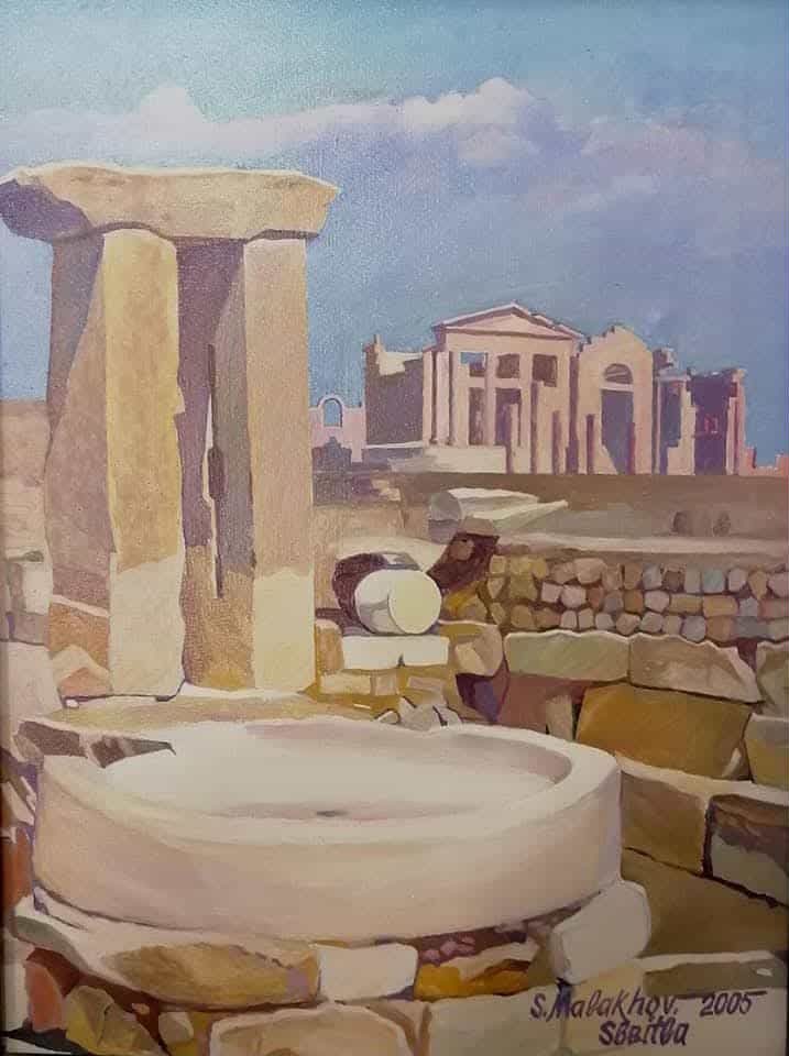Autre passion de l’artiste, les sites archéologiques sont également très présents dans ses collection de tableaux. On y retrouve surtout Dougga et Sbeitla, peints sous plusieurs facettes et gorgés de lumière. On y retrouve aussi El Djem et son amphithéâtre ou les aqueducs romains et les rivages de Carthage. Très précis dans son travail, Malakhov restitue la patine des monuments et aussi leur puissance. Il semble nous inviter à méditer sur la fuite du temps et la permanence de la pierre. Ou encore sur la dialectique incessante entre la mer et la terre, le fluide et le solide. Ces jeux auxquels se livre l’artiste sont présents dans chacune de ses oeuvres, quelqu’en soit la technique.
