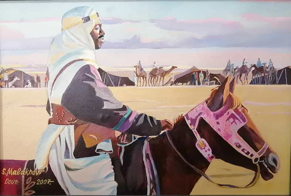 Qu’ils soient cavaliers ou bédouins, les gens du sud sont aussi très présent dans l’oeuvre de Malakov. On y retrouve les caravaniers et leurs chameaux, les cavaliers tout à leurs joutes équestres et aussi les femmes dans leurs costumes rutilant de lumière. Il se dégage de ces oeuvres une impression de sud profond et aussi une simplicité qui emprunte autant au rustique qu’au bucolique. A regarder ces oeuvres, on imagine aisément l’artiste et son attirail planté en pleine nature ou bien esquissant rapidement un drapé, une silhouette ou un geste ample. Ces scènes de vie capturées entre Sned, Tamerza, Chenini ou Nefta sont des témoignages éloquents d’une passion pour le sud.