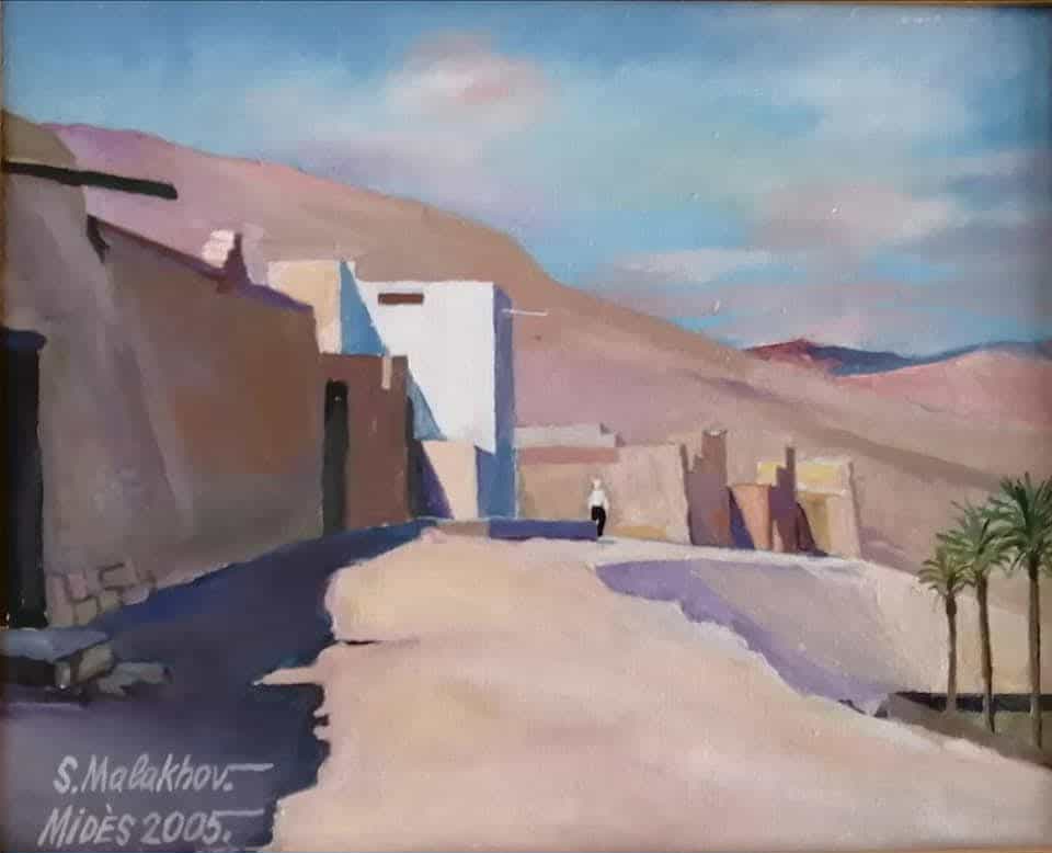 Les paysages de Malakhov sont pluriels. Il aimait errer au gré de l’inspiration pour capturer l’atmosphère des villes nimbées de lumières ou celle de ruelles dans les médinas du pays. Ses tableaux nocturnes sont un régal en soi: sous la pleine lune, il y restitue des pans de médina obscures et recouvre le réel d’un halo bleuté. Cette série de Nocturnes urbains vaut à elle seule le détour et, rarement, artiste aura travaillé et excellé dans cette direction précise. Vivant dans le sud, Malakhov avait aussi une nette prédilection pour les oasis et leurs miracles jaillissant sous la forme de cascade ou d’échappées vertes dans une nature âpre.