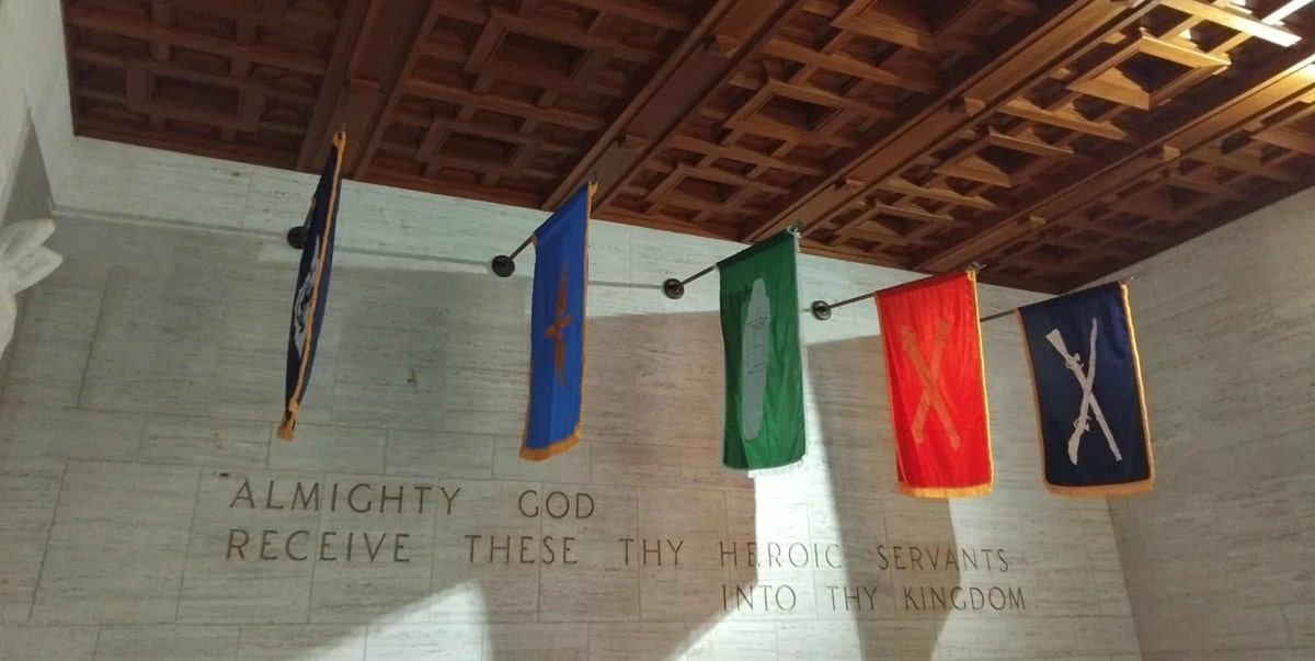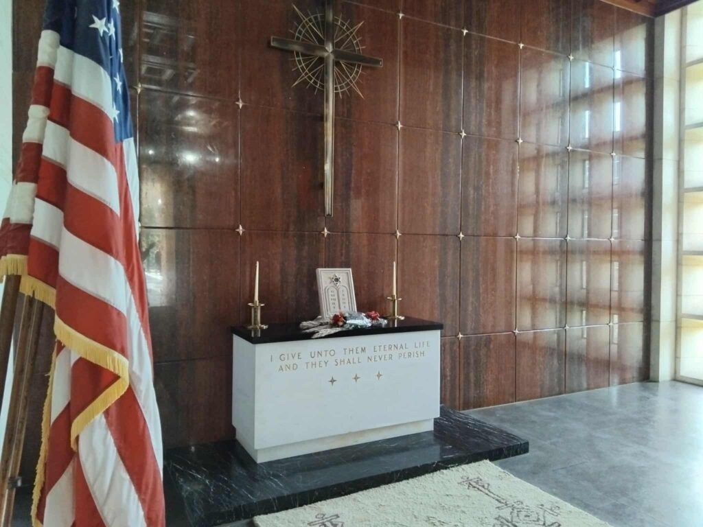 Dans le Mémorial de Carthage, le seul de tout le continent africain, une chapelle surplombe le cimetière. On y reconnaît près de l’autel, le drapeau US et ceux des aumôneries militaires. Les drapeaux des différentes armées sont quant à eux alignés en hauteur.