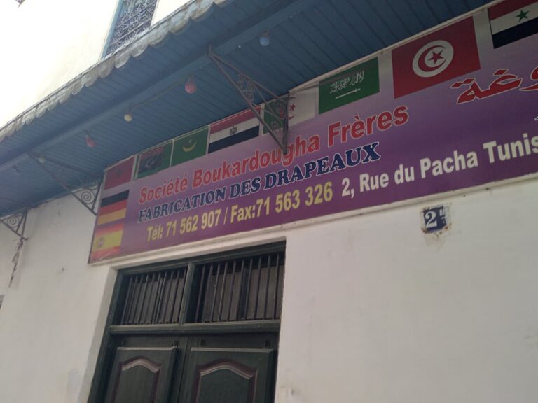 Ils fabriquent des drapeaux de tous les pays ainsi que des fanions ou des écussons. Fournisseurs des communes et des ministères, les Frères Boukardougha et les professionnels de leur secteur ont bien sûr le drapeau national tunisien pour spécialité !