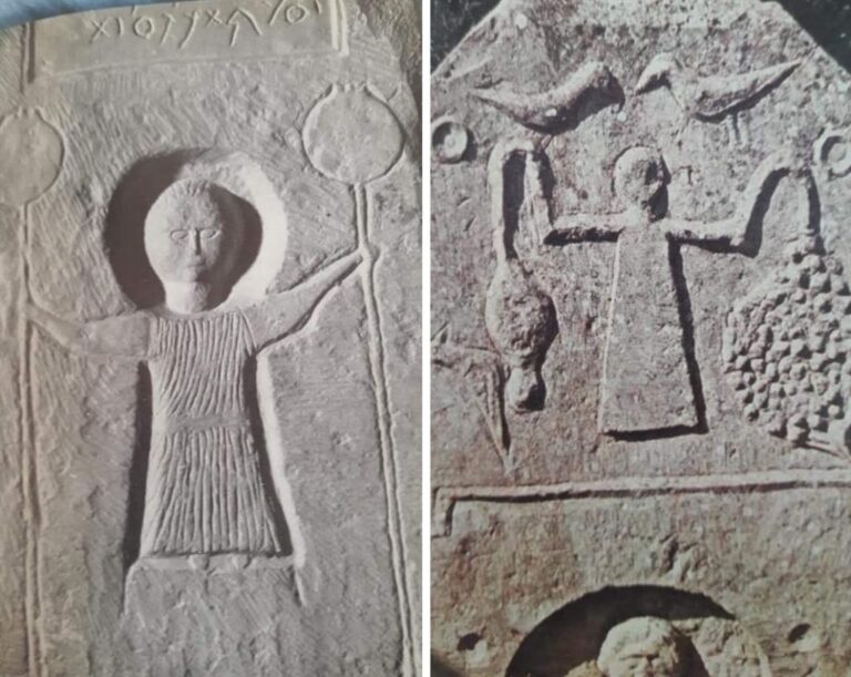 La première est une stèle où l’on retrouve le signe de Tanit avec dans un bras une grenade et dans l’autre une grappe de raisin.
