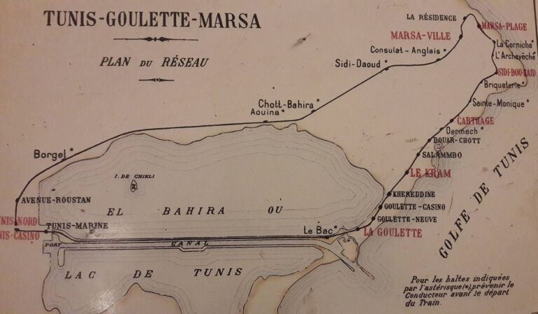 La première ligne partait de la gare Tunis-Casino, à peu près au niveau du Café de Paris actuel, pour rejoindre le port et à travers le lac, la Goulette et la Marsa.