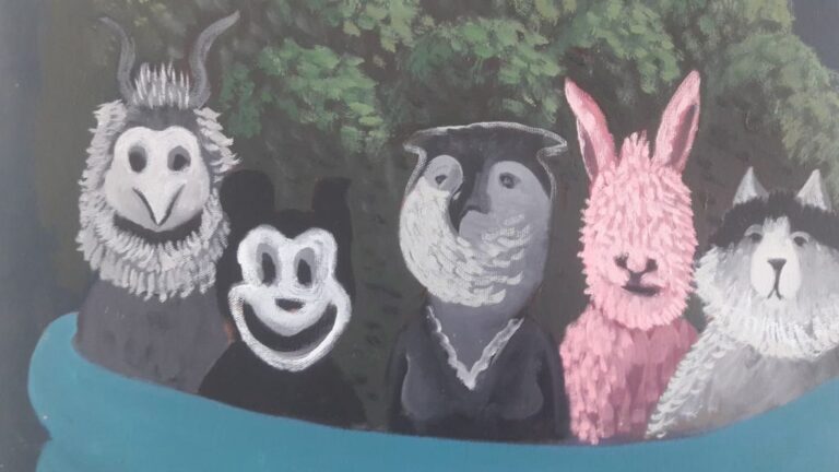 PeuplĂ©e de chimères, les peintures de Ben Slama instaurent un monde dans lequel aussi bien les lieux que les personnages sont irrĂ©els, comme surgissant d’un bestiaire cruel oĂą l’humain perdrait ses attributs et se diluerait dans la fantasmagorie.