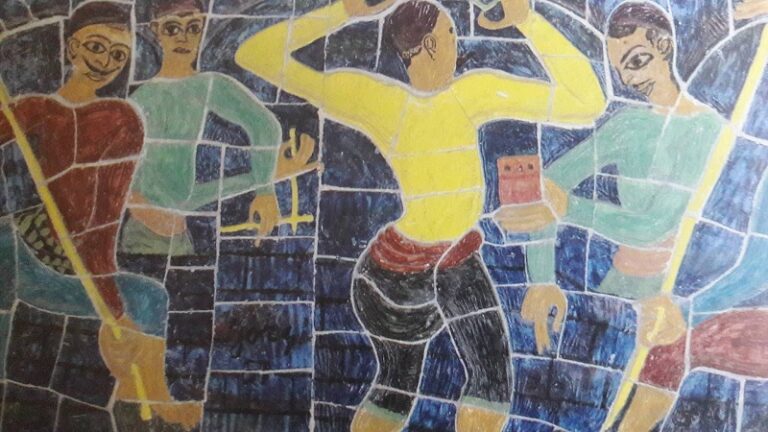 Dans ce même hall, il existe une autre fresque de Gorgi, réalisée selon la même technique et représentant les potiers de Kallaline.