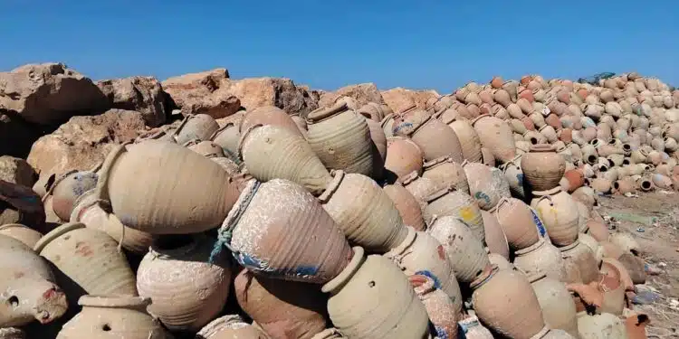 Au port de pêche de Houmt Souk, entre les barques et l’horizon, plusieurs jarres s’amoncellent sur le rivage.
