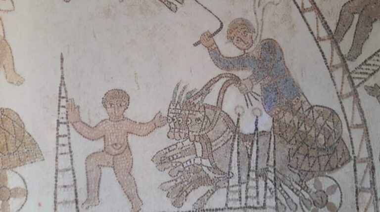 Si le conducteur de char le plus cĂ©lèbre que nous connaissions n’est autre que Ben Hur, celui qui figure sur cette mosaĂŻque semble ĂŞtre surnommĂ© Eros et ses chevaux Amandus et Fructius.