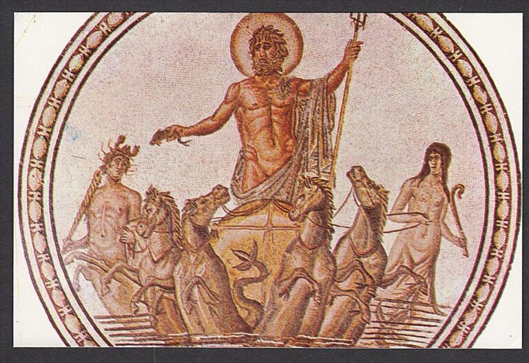Par ailleurs, soulignons que Neptune était dans l’Antiquité le dieu protecteur de la ville de Sousse. Ce dieu de la mer, protecteur des sources et de la vie, est représenté à de très nombreuses reprises dans le corpus des mosaïques de Tunisie.