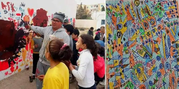 Abbes Boukhobza a récemment entrepris de nombreuses fresques monumentales sur les murs des écoles de Djerba et de plusieurs villes tunisiennes de Kasserine à La Marsa.