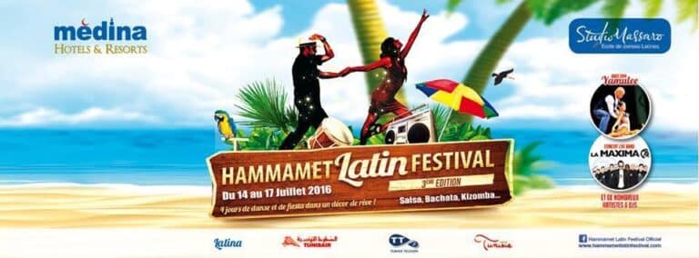 L’édition 2016 du festival des danses latines de Hammamet se tiendra du 14 au 17 juillet 2016 à la Medina Yasmine Hammamet avec la participation de plusieurs centaines de festivaliers et d’une cinquantaine d’artistes internationaux venant de 15 pays différents.