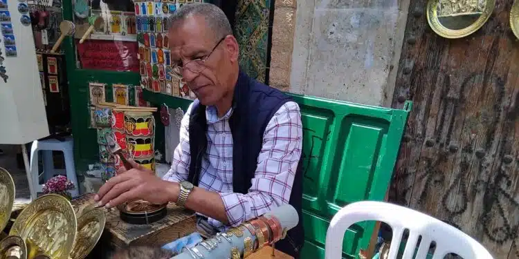 À la rue de la mosquée Zitouna où il est installé, Ezzeddine a regardé défiler des générations de touristes et gravé des milliers de plateaux. Les yeux fixés sur la chorégraphie du stylet, les deux mains au travail, il dialogue avec son métier à graver.