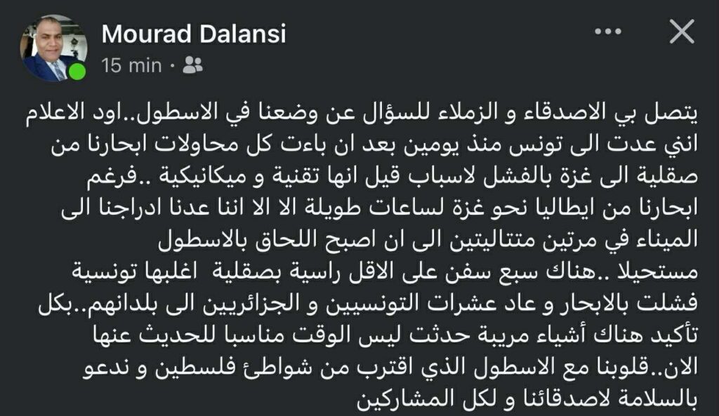 « Des amis et collègues m’ont contacté pour s’informer de notre situation. Je tiens à préciser que je suis rentré en Tunisie depuis deux jours. Toutes nos tentatives de départ vers Gaza depuis la Sicile ont échoué pour des raisons officiellement présentées comme techniques et mécaniques. À deux reprises, nous avons quitté l’Italie et navigué pendant plusieurs heures, avant de devoir revenir au port. Au final, rejoindre la flottille est devenu impossible. »