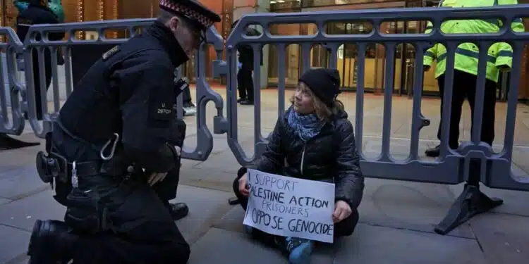 Selon l’association Defend Our Juries, la militante de 22 ans brandissait une pancarte exprimant son soutien aux prisonniers de Palestine Action et dénonçant la situation à Gaza. Les forces de l’ordre ont confirmé l’arrestation d’une femme pour avoir affiché un message considéré comme un soutien à une organisation interdite, sans mentionner son identité.