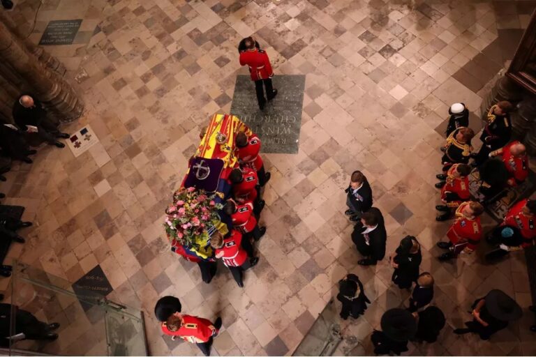 Le cercueil de la reine, drapé de l’étendard royal et de la couronne, est arrivé à l’abbaye de Westminster, sur fond du chant de l’église anglicane, au milieu d’un dispositif sécuritaire impressionnant.