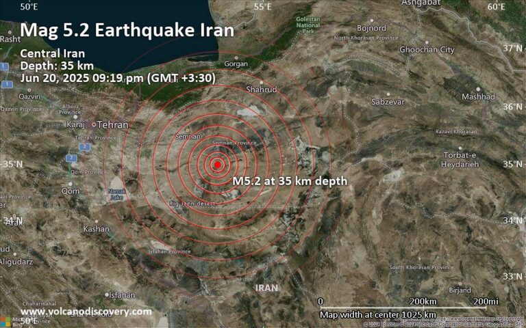 Un tremblement de terre d’une magnitude de 5,2 a frappé ce vendredi 20 juin 2025 à 20h49 (heure locale) à environ 87 km au sud-est de Semnan, dans la province du même nom, en Iran. L’information a été rapportée par le Centre sismologique euro-méditerranéen (EMSC).