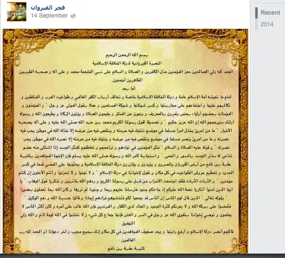 Le groupe terroriste Katibat Okba Ibn Nafaa aurait annoncé, de la ville de Kairouan, son  soutien à l’organisation djihadiste Etat islamique (EI), le dimanche 14 septembre, sur la page facebok Fajr Al-Quairaouen. Le site américain SITE  a repris l’information ainsi que plusieurs comptes « islamistes » sur les réseaux sociaux notamment sur Facebook « Akhbar Al Jihad » (les nouvelles du djihad).