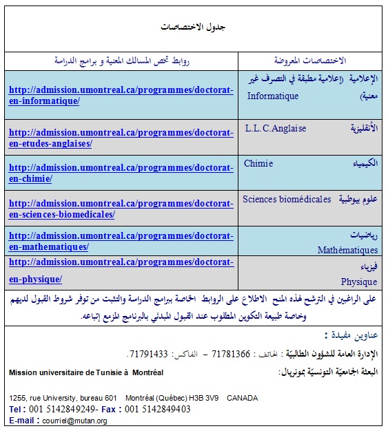 Dans le cadre de l’accord conclu entre les établissements de l’Enseignement Supérieur de la République Tunisienne et l’Université de Montréal au Canada, le ministère de l’Enseignement Supérieur et de la Recherche Scientifique annonce qu’il met à la disposition des étudiants désirant poursuivre leurs études en Doctorat à ladite Université, 10 bourses au titre de l’année universitaire 2014/2015, dans les spécialités indiquées ci-dessous.