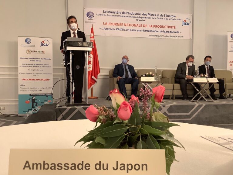 D’ailleurs, l’Ambassadeur japonais Shimizu a assistĂ© rĂ©cemment avec la prĂ©sence de Neila Nouira Ghonji, Ministre de l’Industrie, des Mines et de l’Énergie, Ă  la JournĂ©e Nationale de la ProductivitĂ© “L’Approche KAIZEN, un pilier pour l’amĂ©lioration de la productivitĂ© “, fruit d’une coopĂ©ration rĂ©ussie entre le Japon et la Tunisie.