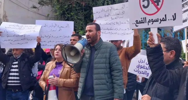 Ce sit-in vient en protestation contre la situation de crise que connaissent les établissements médiatiques en plus des politiques de répression sur les libertés et la traduction devant la justice de journalistes et militants de droits de l’Homme en vertu du décret loi N°54 rejeté par plusieurs partis politiques et composantes de la société civile « .