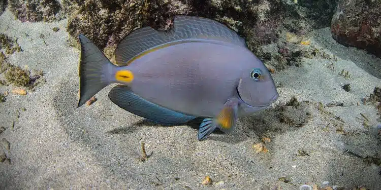 Le spécimen se distingue par une tache orange située à la base de la queue, un marqueur morphologique caractéristique qui facilite son identification. Espèce tropicale, le poisson chirurgien africain évolue habituellement dans l’est de l’océan Atlantique, depuis les côtes du Maroc jusqu’à l’Afrique de l’Ouest.