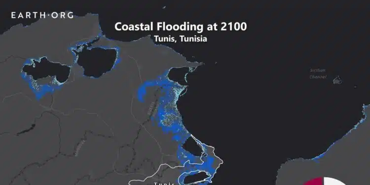L’expert en environnement et en climat Hamdi Hached a relayé une simulation d’Earth.org montrant l’impact de la montée des eaux en Tunisie à l’horizon 2100. Selon les scénarios, entre 1 et 3 mètres d’élévation du niveau de la mer pourraient toucher directement le littoral du Grand Tunis, avec des répercussions sur l’habitat, l’économie et l’environnement.