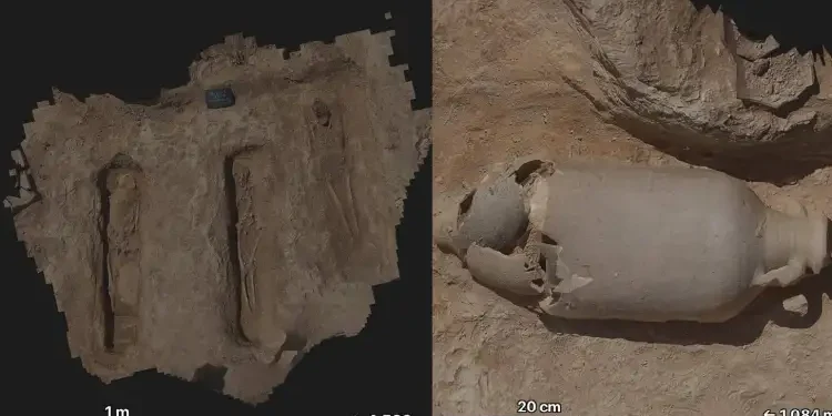Deux types de sépultures ont été identifiés. Le premier consiste en des jarres funéraires utilisées pour l’inhumation d’enfants, une pratique courante dans l’Antiquité. Le second groupe est constitué de fosses avec des squelettes protégés par des fragments de céramique courbée.