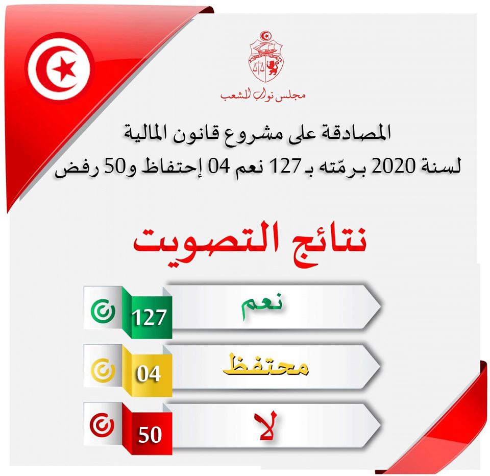 L’Assemblée des représentants du peuple (ARP) a adopté, ce mardi 10 décembre 2019, lors d’une séance plénière, le projet de loi de finances 2020 dans son intégralité avec une majorité de 127 voix pour, 50 contre et 4 abstentions.