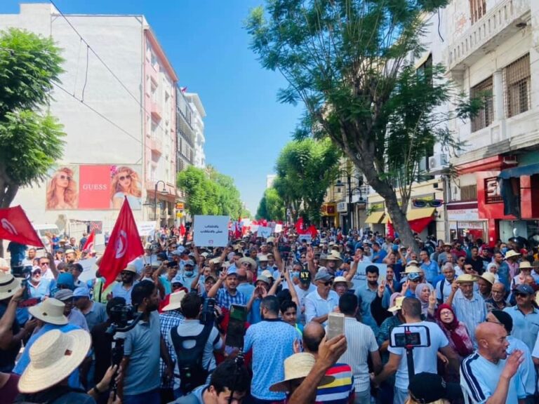 Les partisans du Front de salut national manifestent, ce samedi 23 juillet 2022, contre le référendum du 25 juillet. Des centaines de personnes sont parties du Passage et se sont dirigées vers le Théâtre Municipal de Tunis, appelant à « stopper » le projet du président Kais Saied.Le Front du Salut national arrive en tête de liste des boycotteurs du référendum, aux côtés du mouvement Ennahdha, Qalb Tounes, la Coalition Al Karama, le Hirak, « Citoyens contre le coup d’Etat », le mouvement Amal, Al Irada, le Courant démocrate, Ettakatol, al Qotb, le parti Républicain et le Parti destourien libre.