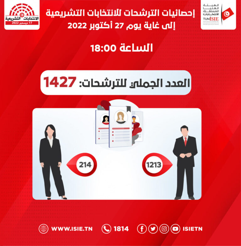 L’instance supérieure indépendante pour les élections (ISIE) a annoncé, ce vendredi 28 octobre 2022, sur sa page Facebook, qu’à la date du 27 octobre à 18h00, date de clôture des dépôts de dossiers de candidatures, elle a réceptionné 1427 candidatures dans l’optique des élections législatives du 17 décembre prochain. Les candidats se répartissent entre 1213 hommes et 214 femmes.