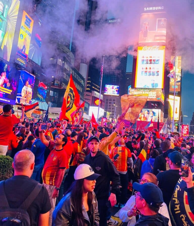 Au son des tambours et des chants emblématiques du club, drapés de rouge et jaune, les fans ont transformé l’avenue la plus emblématique de Manhattan en une véritable tribune populaire. Drapeaux au vent, slogans scandés avec ferveur : l’Espérance était à l’honneur, sous les écrans géants et les regards étonnés des passants.
