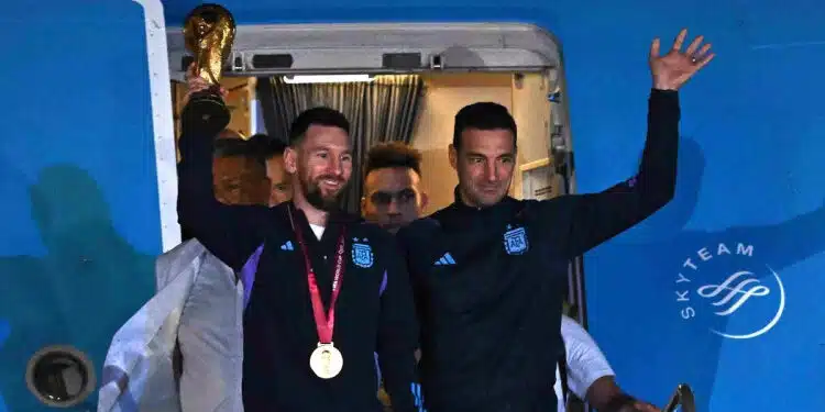 L’Albiceleste a fait son retour au pays avec la Coupe du monde. Lionel Messi et ses coéquipiers ont atterri à l’aéroport international de Buenos Aires. Lionel Messi est sorti le premier, aux côtés de son sélectionneur Lionel Scaloni, pour ensuite gagner le tapis rouge déployé sur le tarmac de l’aéroport d’affaire d’Ezeiza.