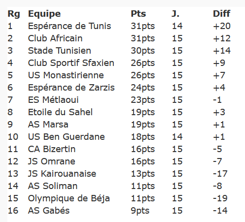 Avec sa lourde défaite 4-0, l’AS Gabès reste lanterne rouge avec 9 points et une différence de buts préoccupante (-14). L’Olympique de Béja, battu par le Club Africain, demeure également sous pression avec 11 points et une défense toujours en difficulté (-19).