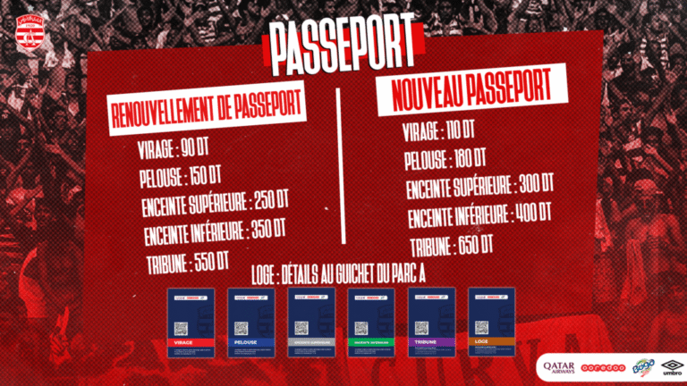 Le Club Africain lance sa campagne de vente d’abonnements. Ainsi, le passeport Club Africain pour la saison 2022-2023, est disponible depuis le 4 octobre 2022 au Parc Mounir Kebaïli.