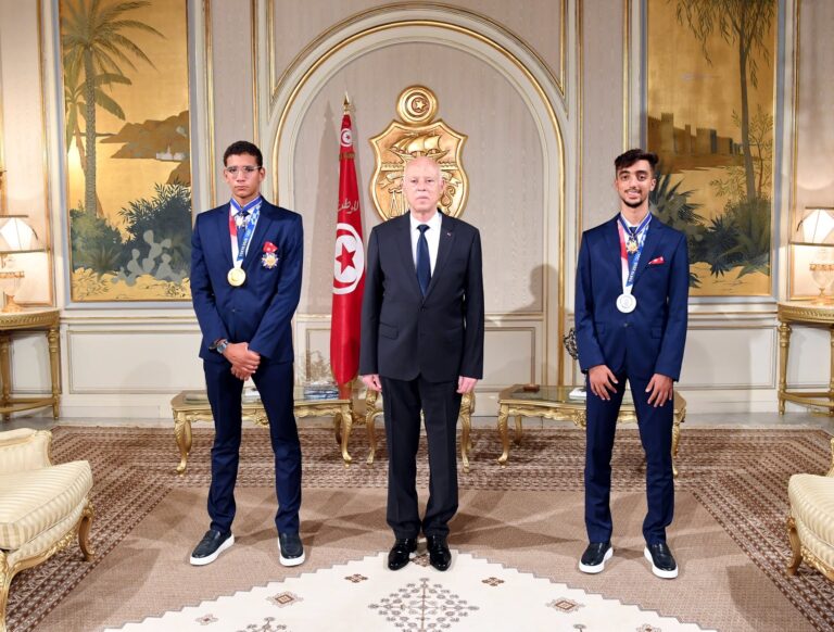 Le Président Kais Saied a également décerné la deuxième médaille du mérite sportif à Mohamed Khalil Jendoubi, médaillé d’argent des moins de 58 kg en Taekwondo.