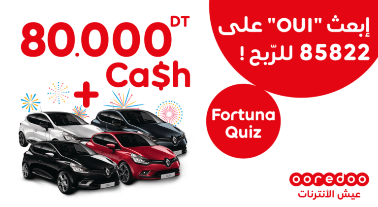 Le méga quiz Fortuna a démarré le 20 octobre 2021 avec une possibilité de participer via l’ensemble des services offerts par Ooredoo. L’inscription au jeu se fait par SMS, Chatbot, application My Ooredoo ou le site web de l’opérateur.