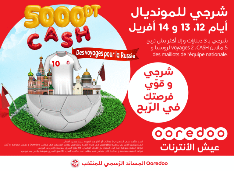 Ooredoo Tunisie, sponsor officiel de l’équipe nationale, vient de lancer un jeu de loterie permettant à ses abonnés de gagner 5 mille dinars cash, des voyages en Russie et beaucoup d’autres cadeaux !